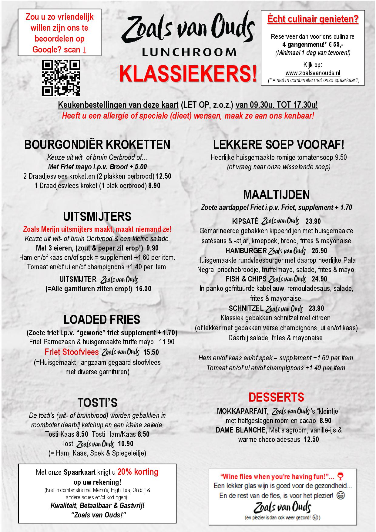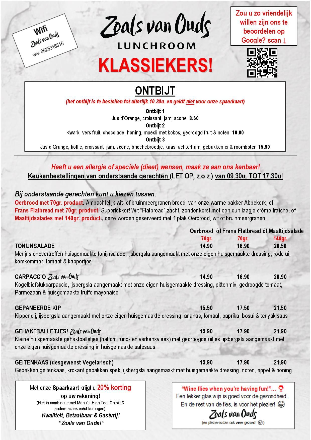 Menukaart “Klassiekers” met o.a. Ontbijt, Broodjes & Salades.
